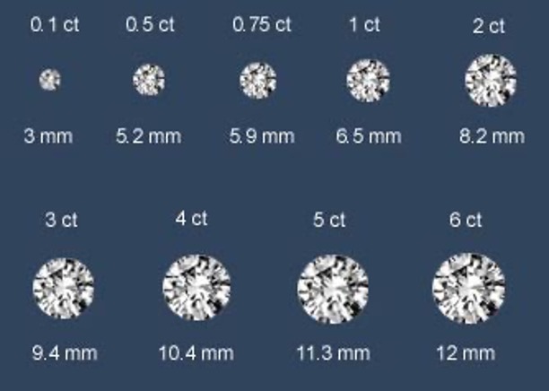 En general, podemos decir que un brillante de tres milímetros pesa aproximadamente 0.1 quilate (diez puntos), un diamante de 5.2 mm tiene peso aproximado de 0.5 ct, mientras que un diamante de un quilate mediría unos 6.5 mm.